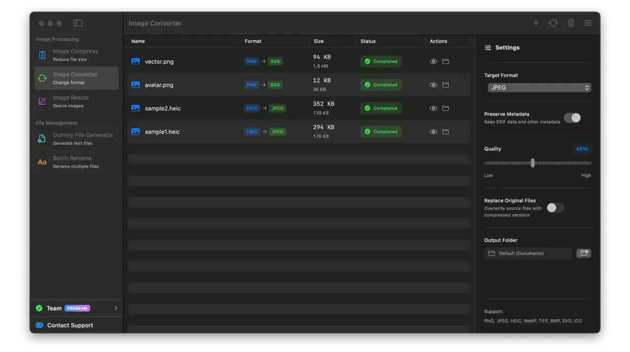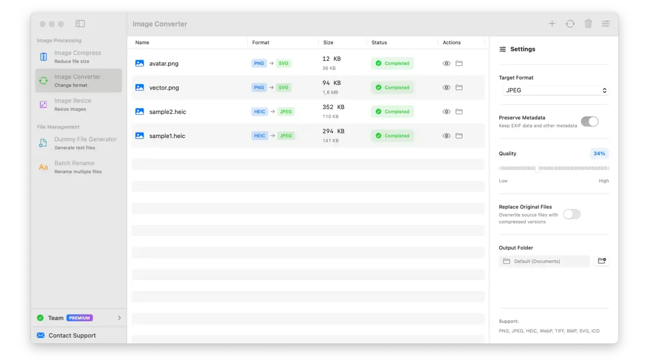 Convert images between all major formats: PNG, JPEG, WebP, HEIC, TIFF, BMP, SVG, and ICO. Batch process with customizable quality settings for each format.